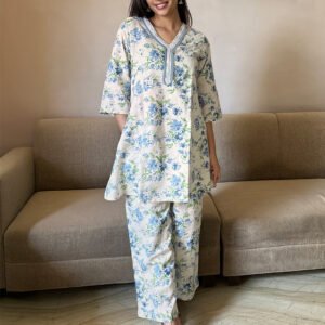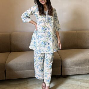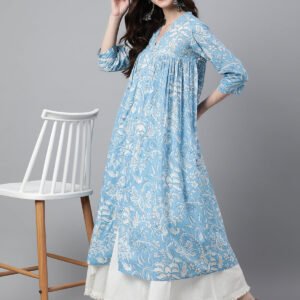 Sky Blue Cotton Floral Print Flared Kurta