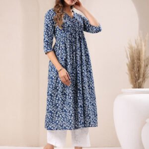 Indigo Pure Cotton Floral Printed Pleated Kurta