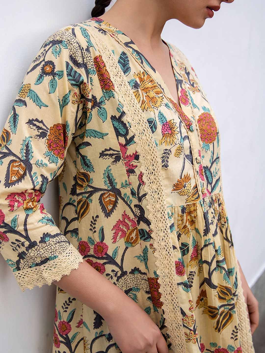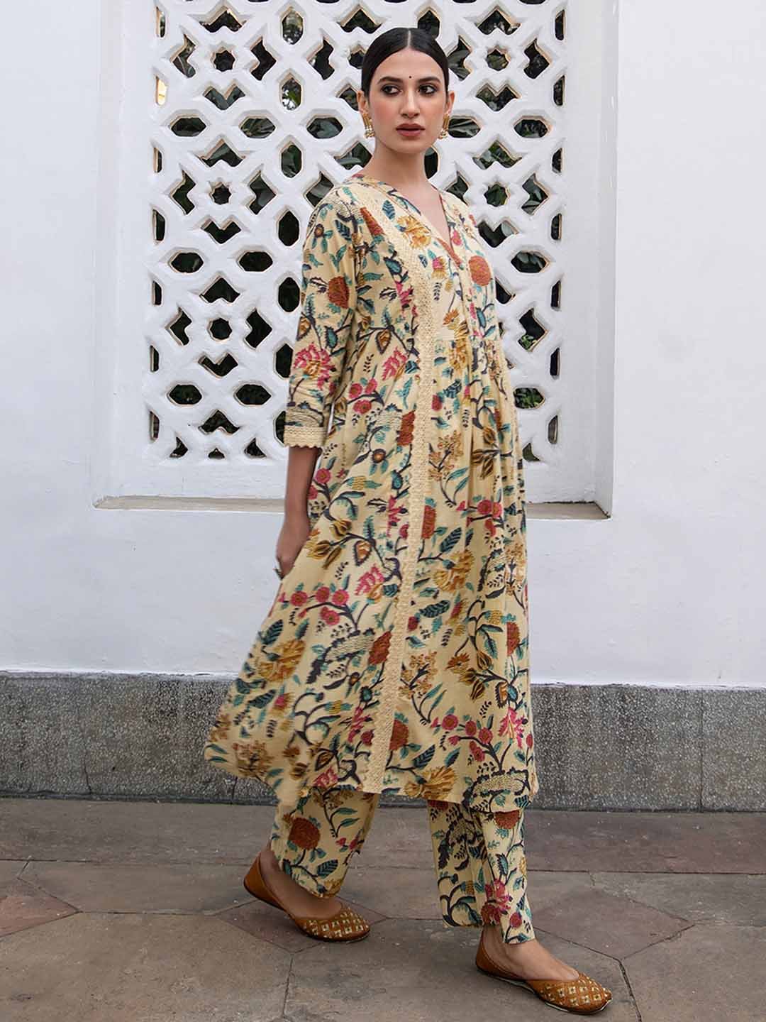- Embrace your modern wardrobe with the cotton gathered kurta set from Janasya, enhanced with an intricate floral print, the Kurta features a classic beige hue that boasts a V-neck with lace details and button ornamentation. It is paired with a straight palazzo equally beautiful to the style. Enhance the look by adding minimal accessories and a makeover to grace up any upcoming occasion.