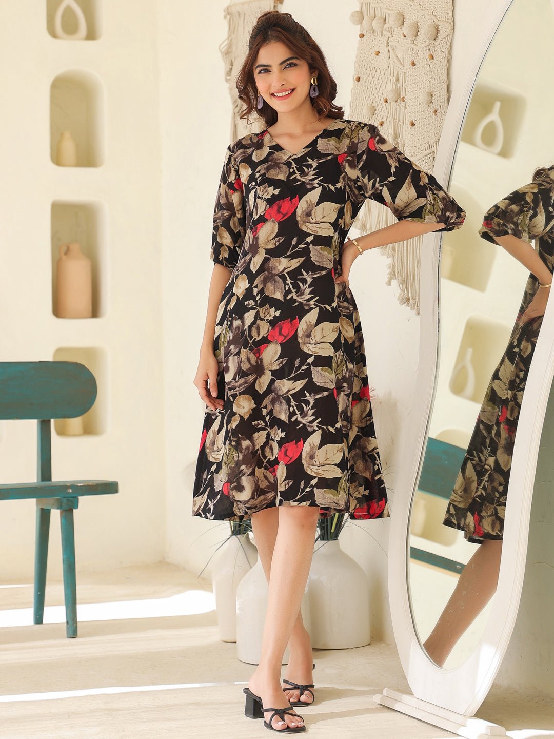 - Elevate your everyday style with this black floral print dress crafted from breathable rayon. Featuring a flattering v-neckline, playful balloon sleeves, and a relaxed silhouette that flows with ease, it’s designed for all-day comfort. Complete with a convenient side pocket, this dress is ideal for brunches, casual outings, or simply staying chic on the go.