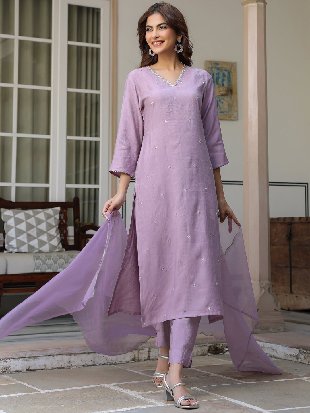 - Revamp your wardrobe with this lavender embellished Chinon kurta pant set with an organza dupatta featuring a v-neck with lace and delicate embroidery details on the front panel, 3/4 sleeves with a straight fit. The kurta is paired with narrow pants in the same fabric and a lightweight organza dupatta with a scalloped border.