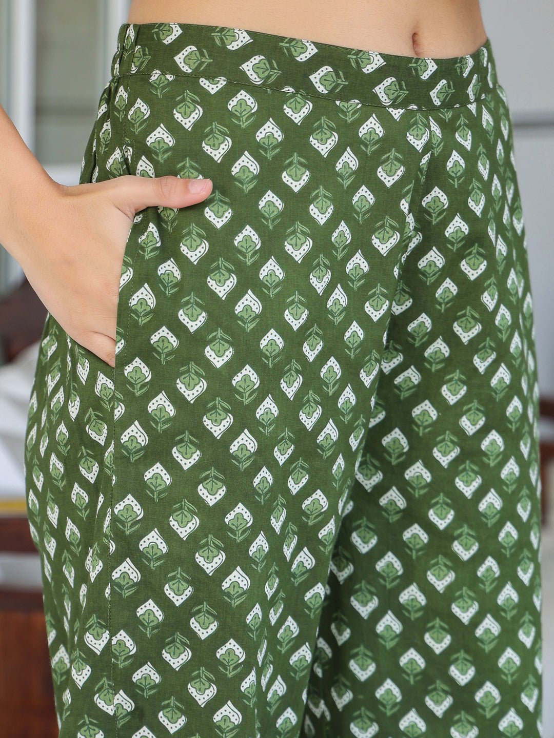 - Elevate your ethnic wear collection with our olive pure cotton floral printed straight kurta set, designed for both comfort and style. The kurta features a sleek straight silhouette adorned with vibrant floral prints and a stylish keyhole neck further complemented by cream laces running parallelly down, radiating a modern charm. Paired with matching olive pants featuring a side pocket for a chic look, the ensemble is completed with a beautifully printed dupatta that adds a touch of elegance.