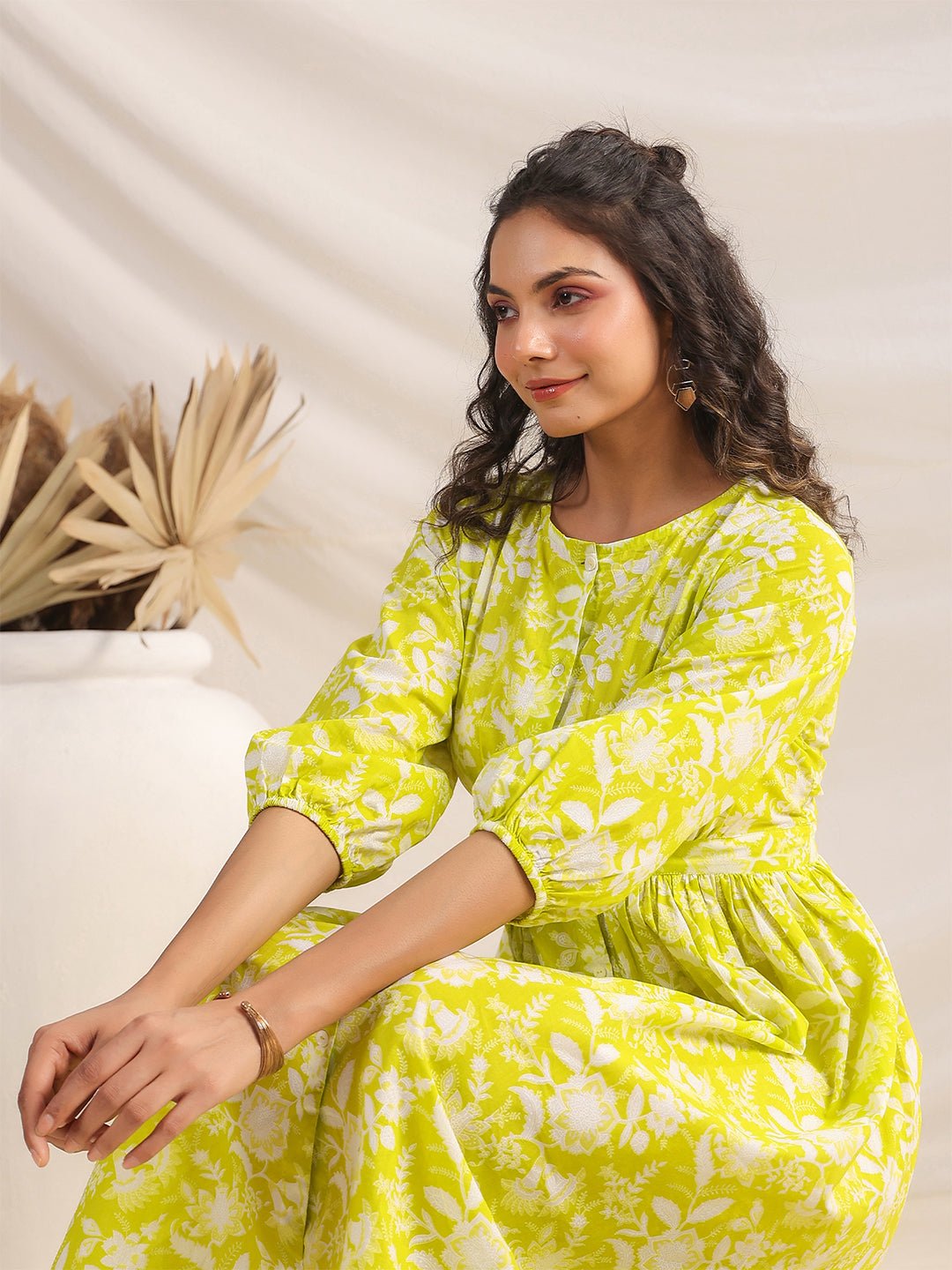 - Dress Length: 44(IN) | Colour: Lime | Pattern: Floral | Occasion: Casual | Style: Gathered | Sleeve Type: Three-Quarter Sleeves (Balloon Sleeves)