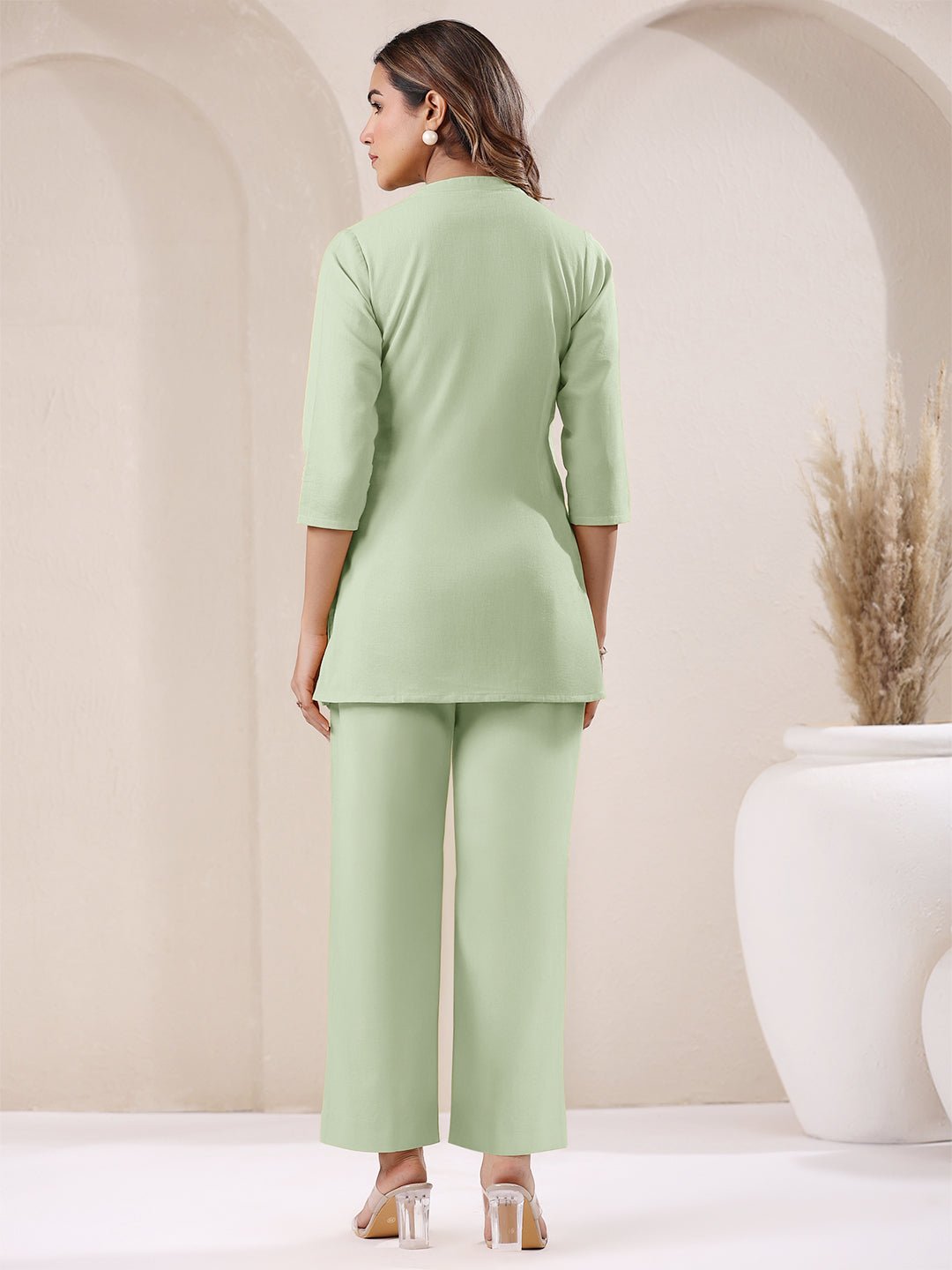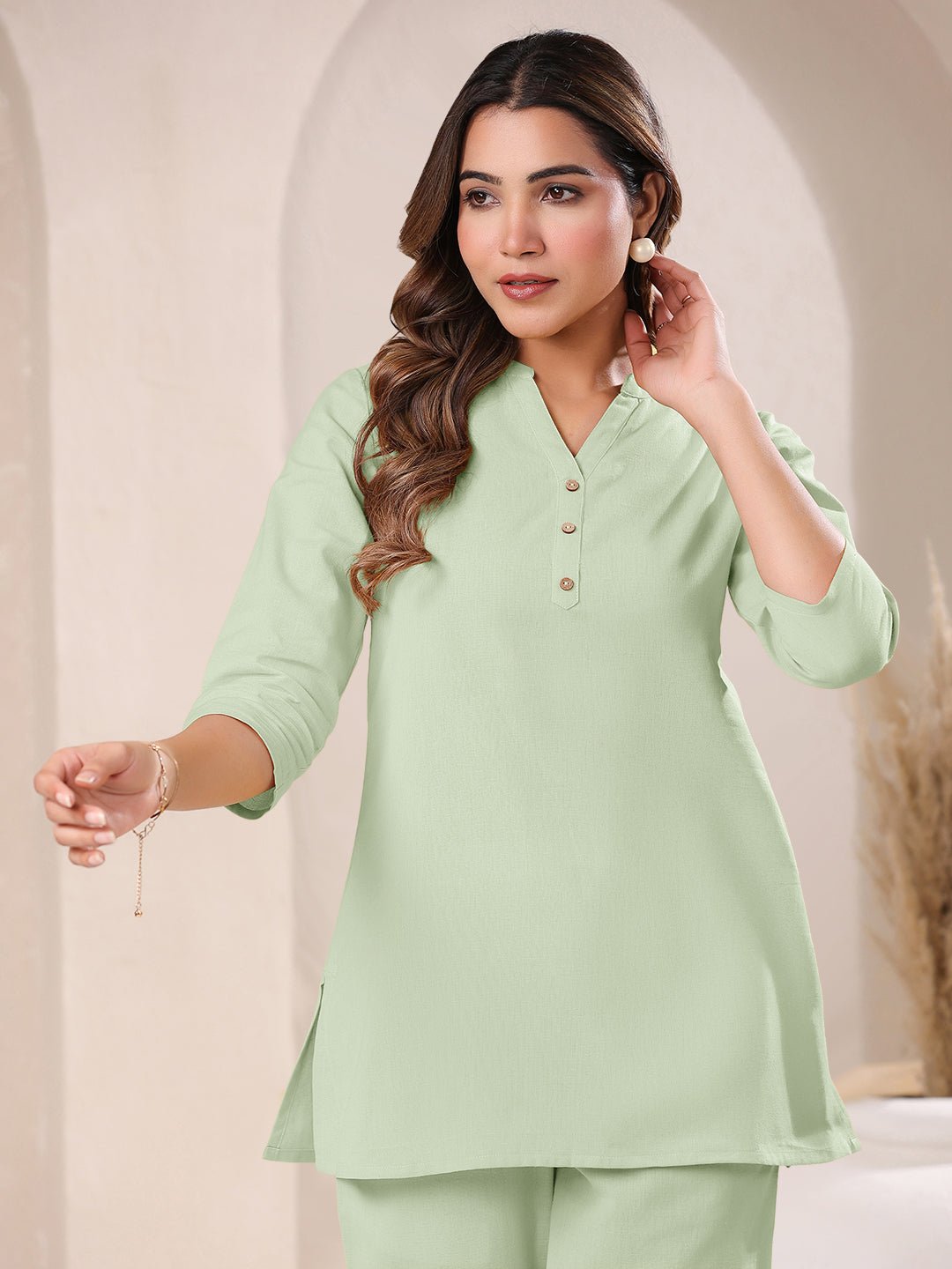 - Elevate your casual wardrobe with this mint green flex cotton solid a-line co-ord set. The top features a chic notch neck with button ornamentation, adding a subtle touch of elegance. Designed in an a-line silhouette, it ensures a comfortable and flattering fit, while the side pocket adds a practical element. Paired with matching elasticated straight pants, this ensemble perfectly balances style and ease. Ideal for everyday wear, this co-ord set brings effortless sophistication to your look.