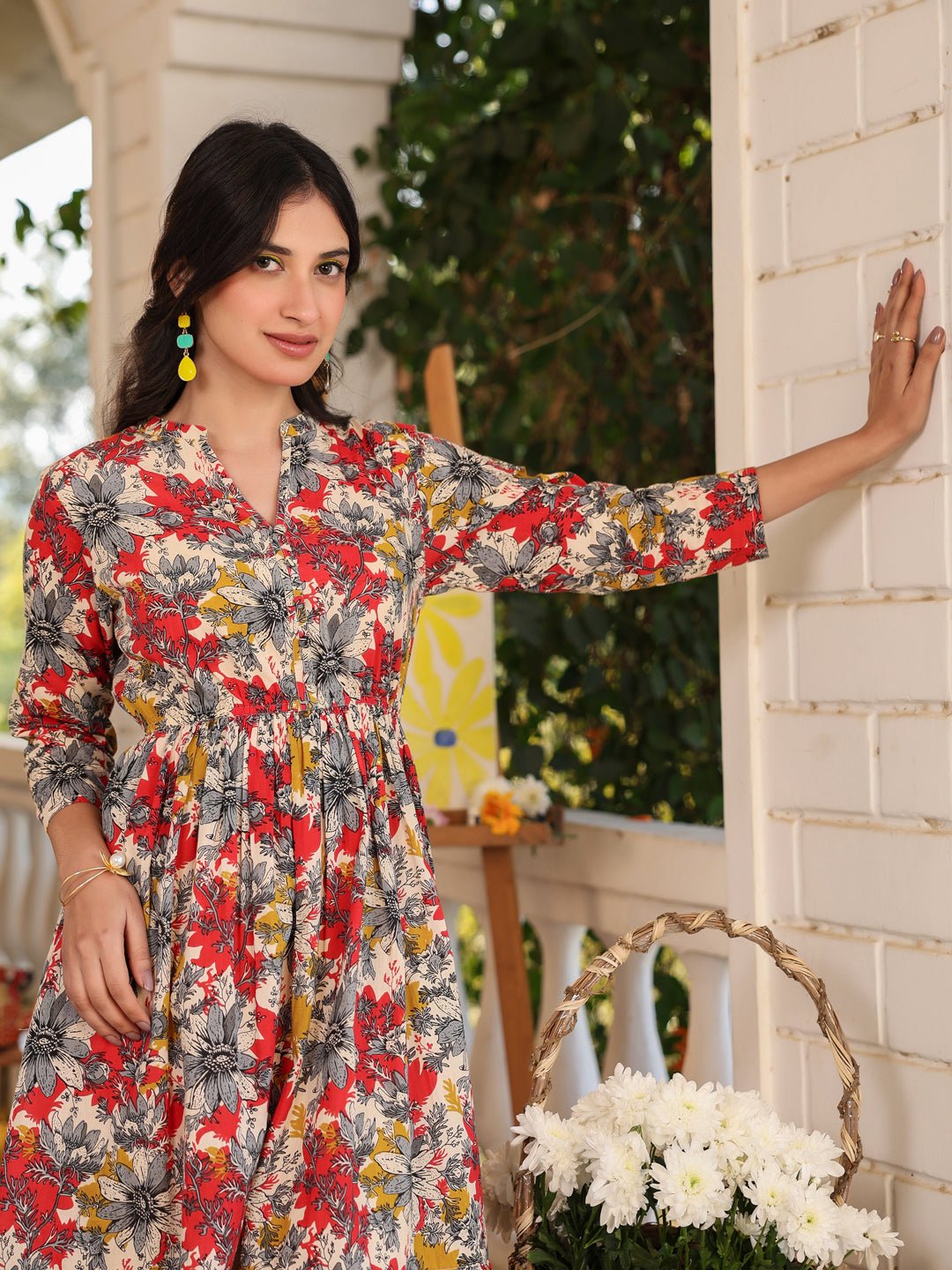 - Step into summer with this vibrant multicolored pure cotton floral printed tiered dress. It features a chic v-neck with a band collar, a flattering waist-cinching silhouette, and a flared tiered skirt featuring a side pocket for effortless charm. The button ornamentation on the yoke adds a touch of elegance, making it perfect for a summer outing. Style it with minimal accessories for a breezy and fashionable look.