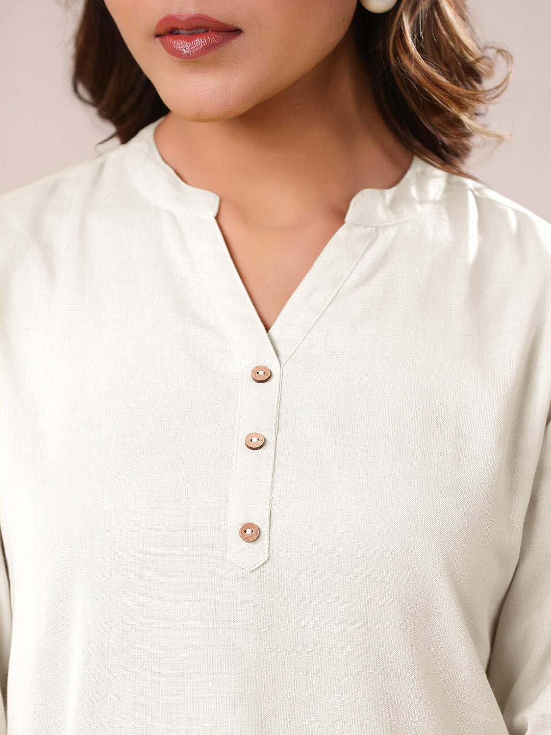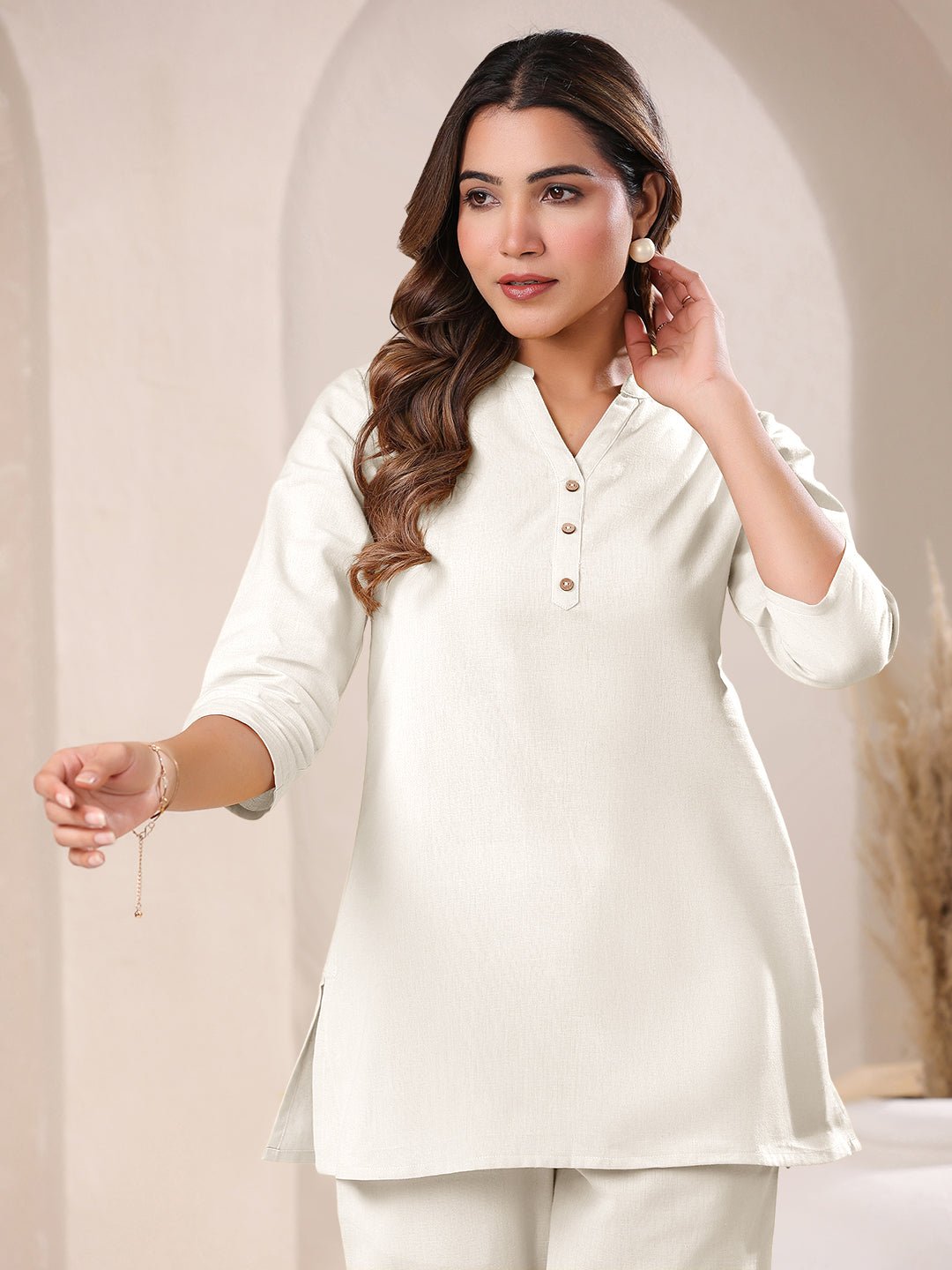 - Elevate your casual wardrobe with this white flex cotton solid a-line co-ord set. The top features a chic notch neck with button ornamentation, adding a subtle touch of elegance. Designed in an a-line silhouette, it ensures a comfortable and flattering fit, while the side pocket adds a practical element. Paired with matching elasticated straight pants, this ensemble perfectly balances style and ease. Ideal for everyday wear, this co-ord set brings effortless sophistication to your look.