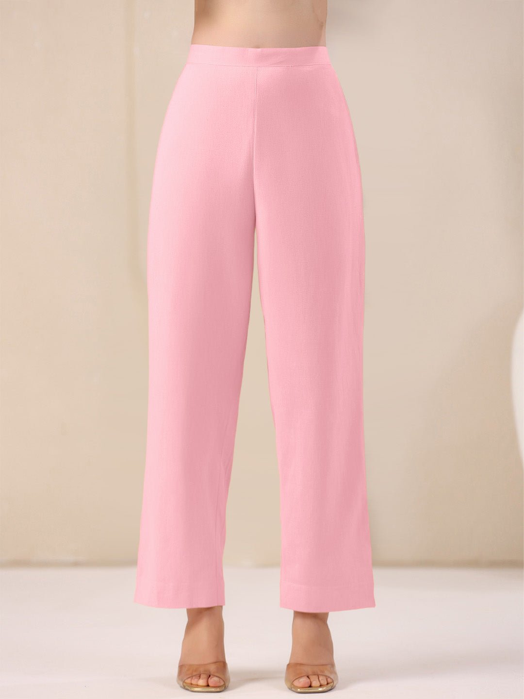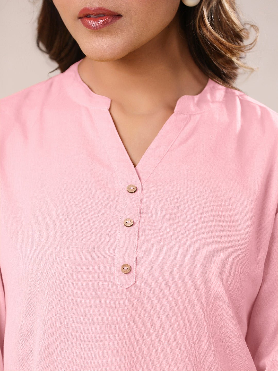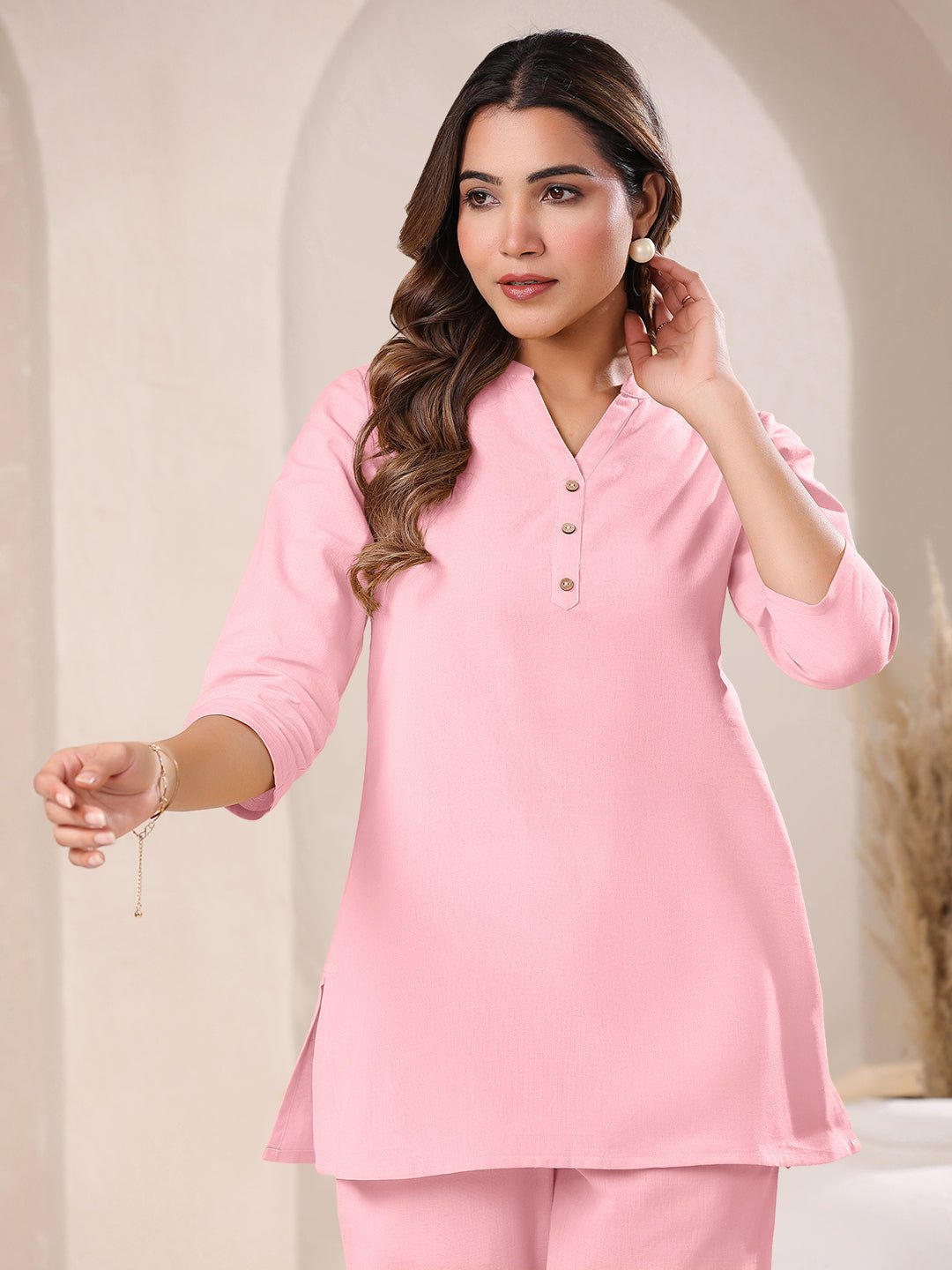 Elevate your casual wardrobe with this pink flex cotton solid a-line co-ord set. The top features a chic notch neck with button ornamentation, adding a subtle touch of elegance. Designed in an a-line silhouette, it ensures a comfortable and flattering fit, while the side pocket adds a practical element. Paired with matching elasticated straight pants, this ensemble perfectly balances style and ease. Ideal for everyday wear, this co-ord set brings effortless sophistication to your look.