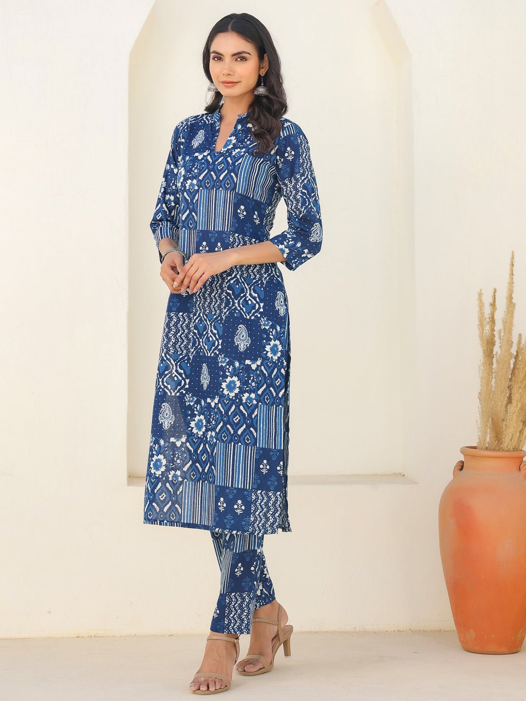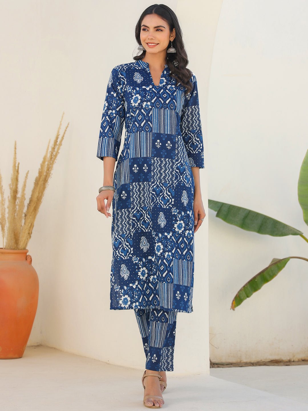 - Make a statement in effortless ethnic style with this pure cotton indigo ethnic motifs printed straight kurta set. The straight-fit kurta features a flattering v-neckline with a band collar and is adorned with subtle ethnic motifs for a timeless appeal. Crafted in breathable cotton, the kurta is paired with matching printed straight pants, designed with a side pocket for functionality and comfort. This kurta set is perfect for casual days, office wear, or laid-back festive gatherings.