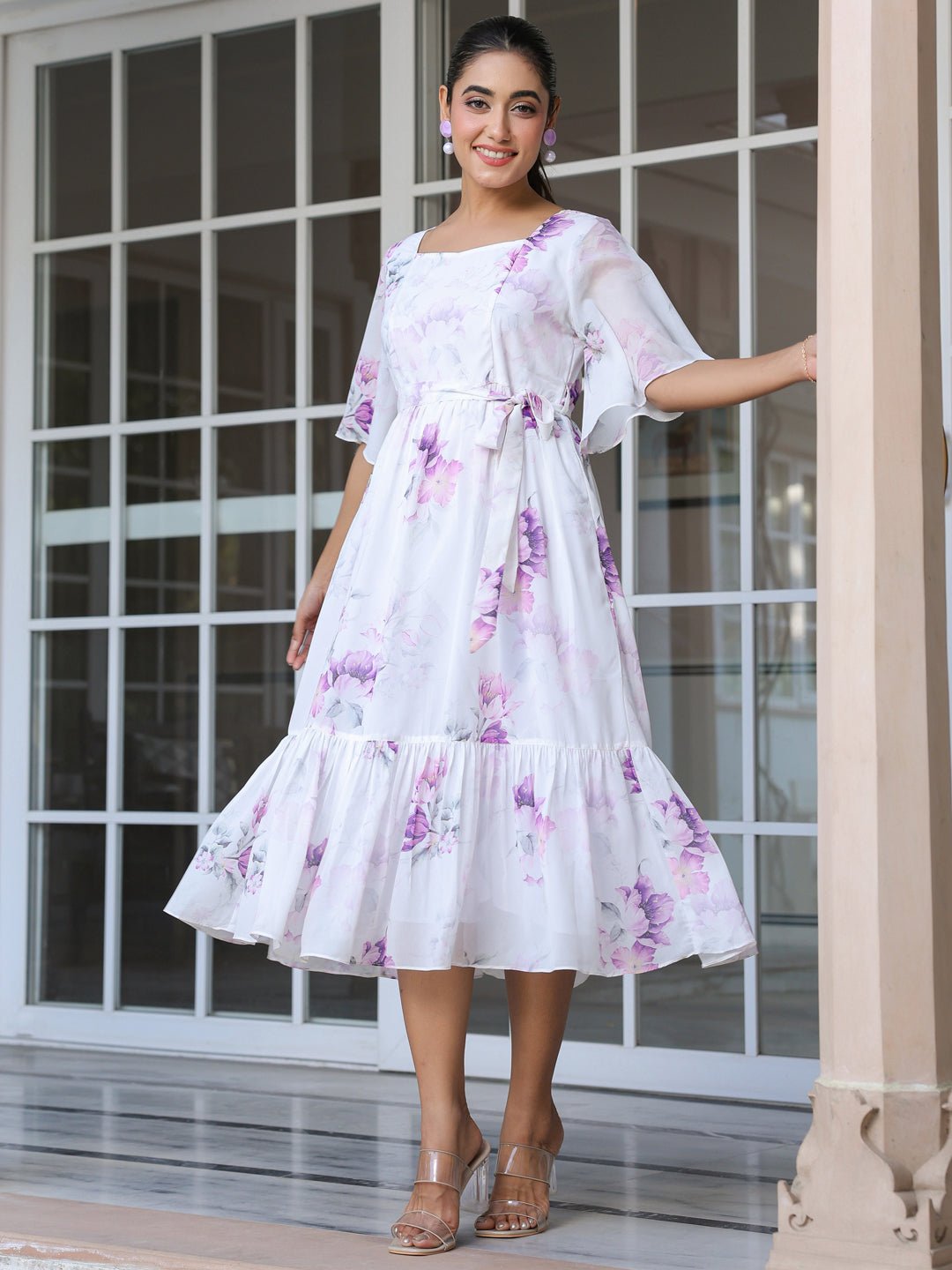 - This white georgette fit & flare dress is a perfect mix of elegance and charm. It features a sweetheart neck, vibrant multicolored floral prints, and short flutter sleeves for a breezy look. The cinched waist with tie-up detailing flatters your figure, while the flared dress adds a graceful touch. The both side pocket, on the other hand, adds ease and practicality. Lined with soft butter crepe for comfort.