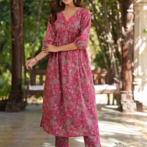 Elegant Pink Pure Cotton Floral Print A-Line Kurta and Pant Set