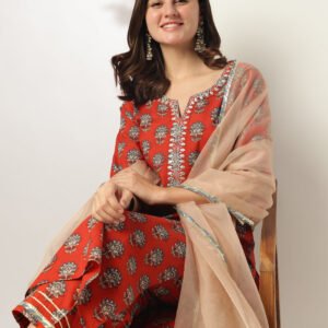 Elegant Red Pure Cotton Floral Printed Yoke Embroidered Straight Kurta Set for a Stylish Look