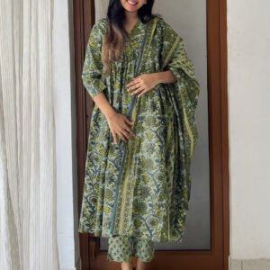 Elegant Sage Green Pure Cotton Floral Anarkali Kurta Set for a Timeless Traditional Look